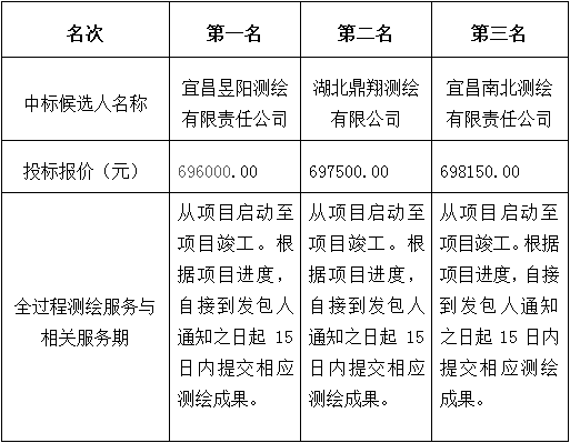 松滋市臨港工業(yè)園擴園(二期)建設項目全過(guò)程測繪服務(wù)項目(第二次)于2023年6月7日發(fā)出招標邀請,2023年6月15日在湖北松滋金松投資控股集團有限公司開(kāi)標室開(kāi)標,并于2023年6月15日完成評標工作。根據評標委員會(huì )提交的評標報告,松滋金松工業(yè)投資開(kāi)發(fā)有限公司已經(jīng)確認評標結果,現進(jìn)行評標結果公示。