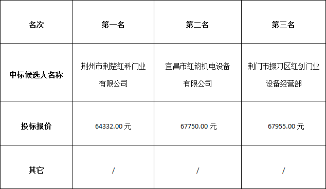 稻谷溪城市濕地公園配套設施設備(大門(mén)電動(dòng)伸縮門(mén))采購項目于2018年11月28日發(fā)布詢(xún)價(jià)邀請函,2018年12月5日在松滋市稻谷溪城市濕地公園會(huì )議室進(jìn)行評標。根據評標小組提交的評標結論,湖北金投物業(yè)管理有限公司已經(jīng)確認評標結果,現進(jìn)行中標候選人公示。